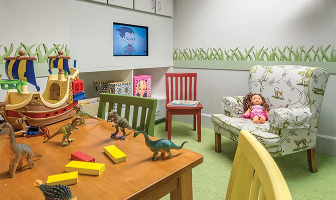 Our reception area is warm and inviting. Complete with a built-in fireplace topped with blown glass artwork. Enjoy a cup of coffee or tea as you catch up on the latest news or learn a new recipe.